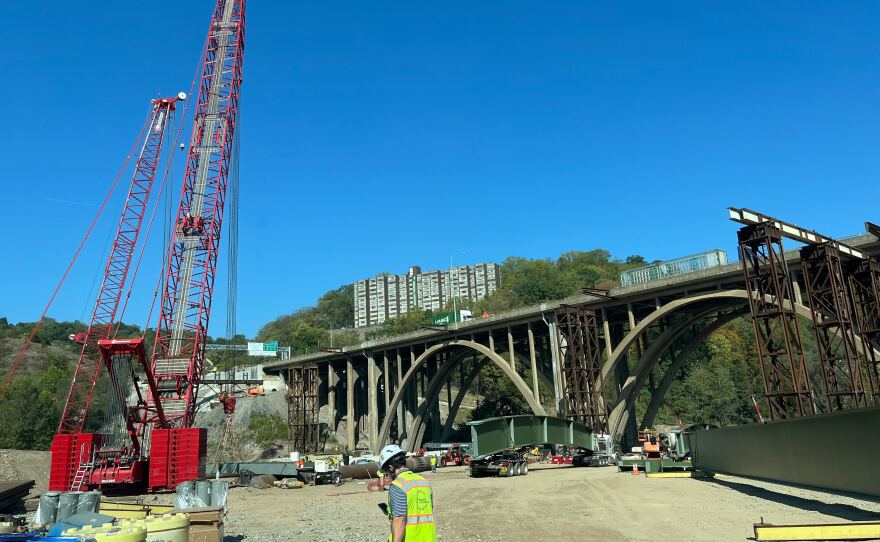 Insert image of the product: Engineers using digital tools to monitor bridge construction.